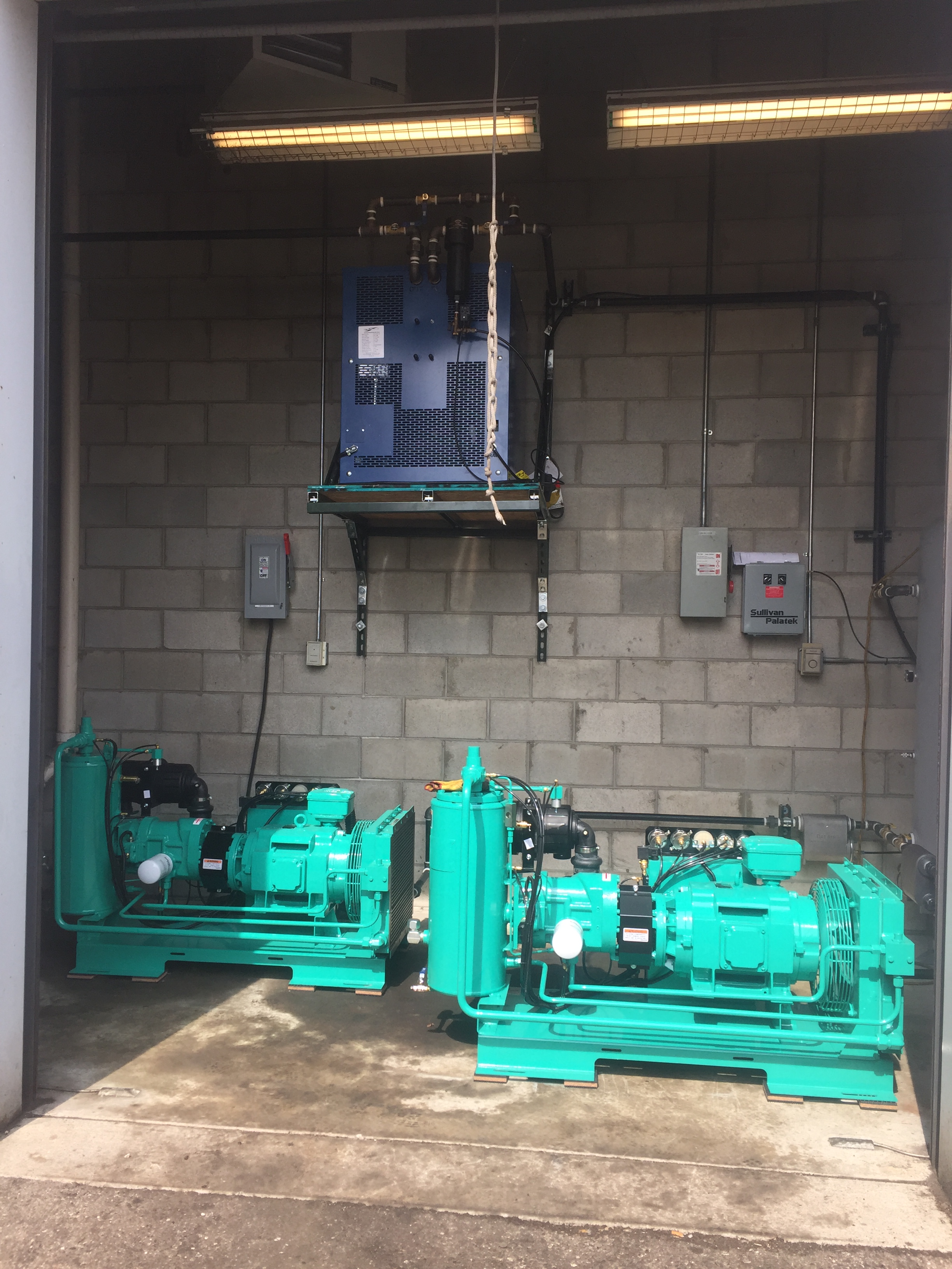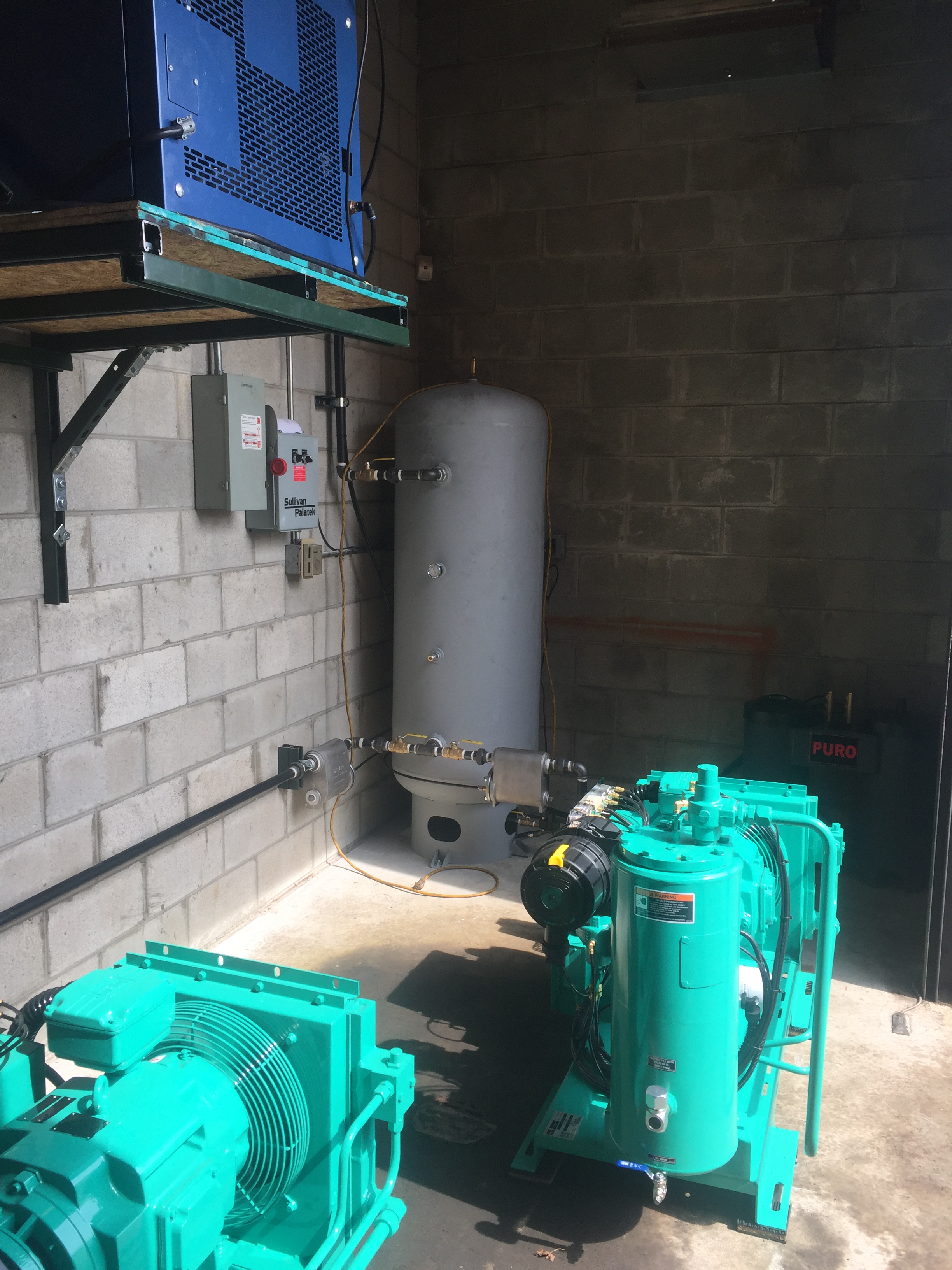 Self contained heated compressor room. 2 x 20HP Sullivan Palatek rotary screw compressors positioned for efficient cooling and easy maintenance. Individual water separators for each compressor. 120 gal control receiver tank. Great Lakes Air GTX-100A-116 100 cfm cycling refrigerated dryer on custom made shelf attached to back wall. All new piping and electrical hookups.